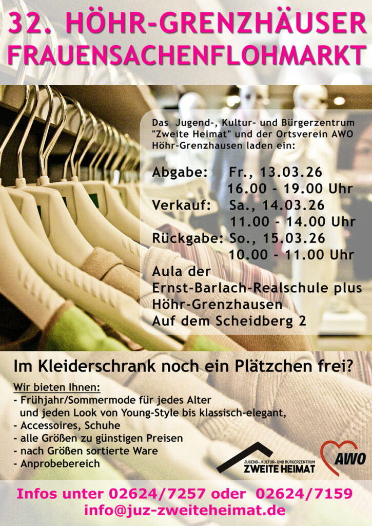 Am Samstag, den 14. März 2026, ist es wieder soweit: Der beliebte Frauensachenflohmarkt in Höhr-Grenzhausen geht in die 32. Runde! Zwischen 11:00 und 14:00 Uhr wird die Aula der Ernst-Barlach-Realschule plus (Am Scheidberg 2) erneut zum Treffpunkt für alle Modefans, Schnäppchenjägerinnen und Liebhaberinnen nachhaltiger Kleidung.