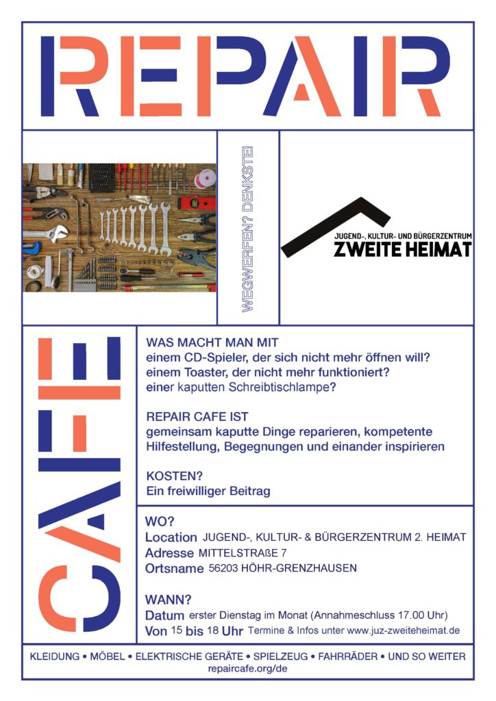 Nach der Weihnachtspause öffnet das Repair Café in Höhr-Grenzhausen wieder seine Türen: Am Dienstag, den 3. Februar 2026, lädt das ehrenamtliche Team des Repair Cafés in das Jugend-, Kultur- und Bürgerzentrum „Zweite Heimat“ zum ersten Repair Café des neuen Jahres ein. Zwischen 15:00 und 18:00 Uhr (letzte Annahme um 17:00 Uhr) haben Besucherinnen und Besucher die Möglichkeit, defekte Alltagsgegenstände mitzubringen und gemeinsam mit erfahrenen Ehrenamtlichen zu reparieren. Unter dem bewährten Motto „Reparieren statt Wegwerfen“ treffen sich auch im neuen Jahr Menschen aus der Region, um kaputten Dingen neues Leben einzuhauchen. Ob Elektrogeräte, Kleidung, Kleinmöbel oder Haushaltsgegenstände – vieles lässt sich mit etwas Geduld, handwerklichem Geschick und fachkundiger Unterstützung wieder instand setzen. Dabei stehen nicht nur Nachhaltigkeit und Ressourcenschonung im Vordergrund, sondern auch der Austausch von Wissen und das Miteinander. „Gerade nach den Feiertagen bringen viele Menschen Dinge mit, die sie eigentlich schon abgeschrieben hatten“, berichtet das Repair-Café-Team. „Oft zeigt sich, dass mit ein paar Handgriffen noch viel zu retten ist – und genau das macht den Reiz unseres Angebots aus.“